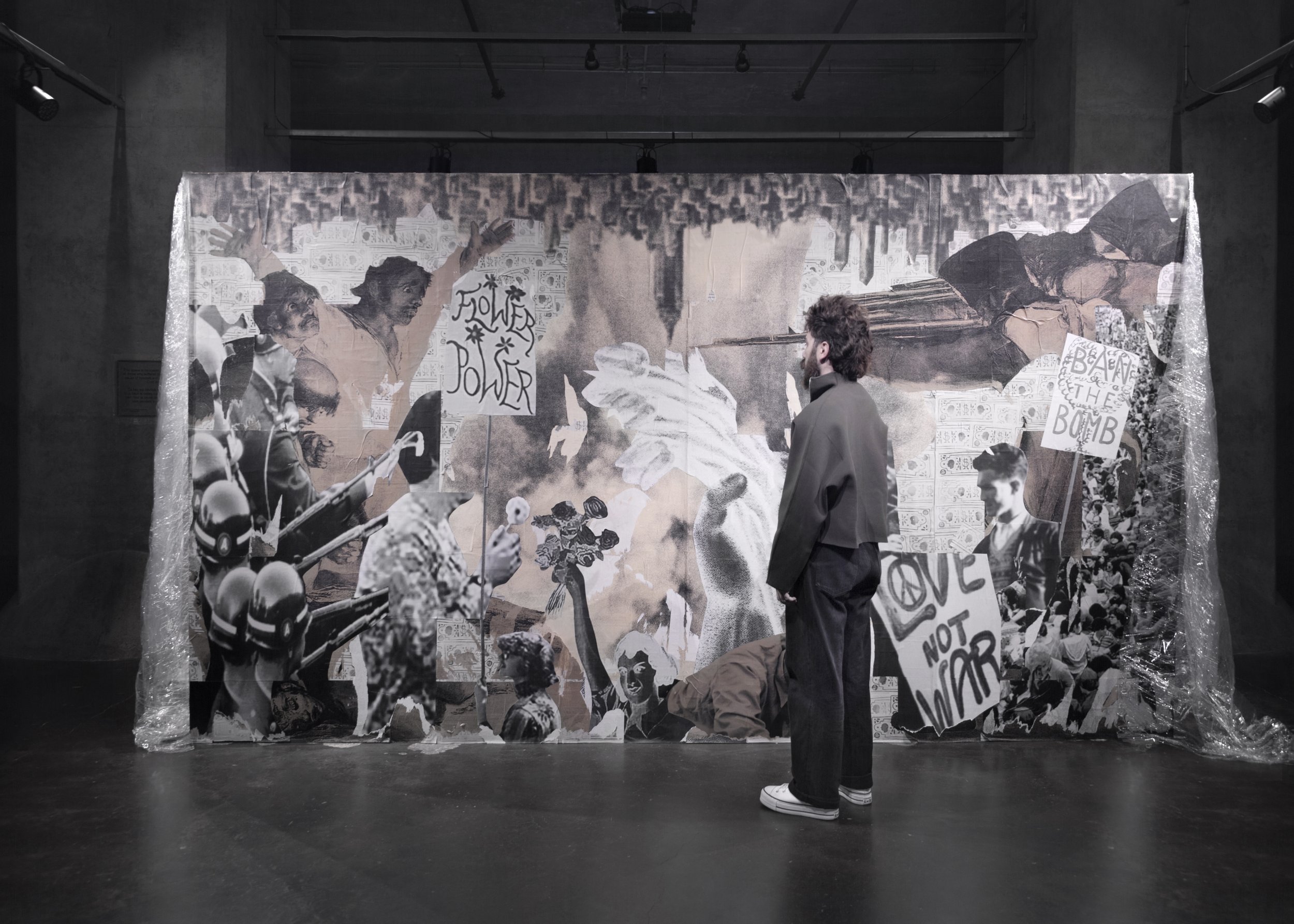 In the Bank of Canada Vault at the Diefenbunker, Neeko Paluzzi uses fictional banknotes — created in the animation language of Norman McLaren’s film Neighbours (1952) — as building blocks of a shelter. The use of currency highlights the inextricable connection between wealth and war, where economies are so often shaped by the conflicts they fund. The structure recalls a section of the Berlin Wall, a prominent visual from our collective memory, and its surfaces are wheat-pasted with a dense collage of disarmament slogans and archival photographs from twentieth-century peace and protest movements. The act of messages torn down and replaced gives the surface a restless, unfinished energy — a visual reminder that protest is never static but, rather, it is constantly rewritten by each generation.